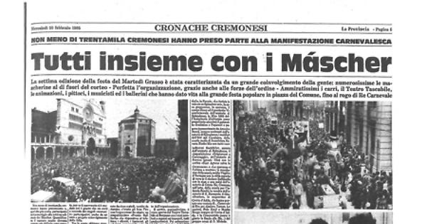 (...) ogni edizione registra sempre un nuovo record di affluenza, favorita nel caso specifico, dalla bella giornata soleggiata anche se, alla lunga, un DO' freddina. Il successo della manifestazione è stato decretato, oltre che dall'organizzazione perfetta, pur se il canovaccio si è snodato (ed è giusto che sia cosi) a seconda dei singoli «momenti » partecipativi, anche da un vero e proprio coinvolgimento della folla. Tra la gente abbiamo visto, più numerose che mai, tantissime mascherine, in misura cer-, tamente superiore agli altri anni; con abiti recuperati in casa o acquistati nei negozi molti, soprattutto giovani, hanno vissuto gioiosamente l'ultimo giorno di Carnevale, il Martedì Grasso. C'erano ragazzine imborotalcate da cima a piedi, vestite da damine; c'erano gli Iron Fire con l'espressione dà «duri»; un simpaticissimo «Pronto Raffaella » che rispondeva al telefono; i risció, i fantasmi, gli scheletri, numerosi Dracula, gli sceicchi, l'organino di Maro tirato da un pony (che era sceso pomposamente da un «horse wagon»), un simpaticissimo «Ce l'ho qui la brioche», preti e suoline, per mano...