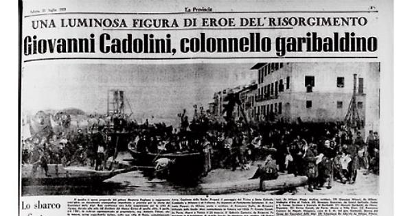 «GIOVANNI CADOLINI - Colonnello Garibaldino - n. 1830; m. 1917 - nelle congiure nell'esilio sui campi di battaglia - e nei maggiori consessi della Nazione - sacrò la intera vita - agli innovati destini d'Italia - XX Settembre 1917-».