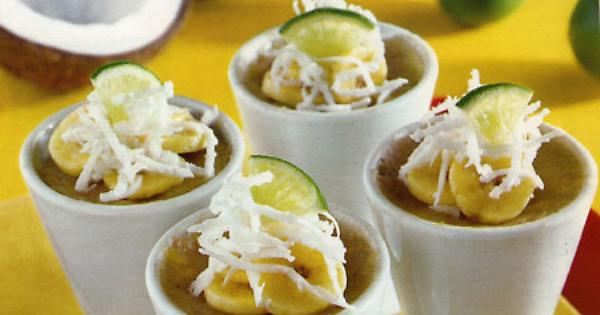 Ingredienti (per 4 persone): 120 gr di farina - 3 banane - 1,5 dl di latte di cocco - 2 lime biologici - 50 gr di zucchero - un pezzetto di noce di cocco fresca - sale.