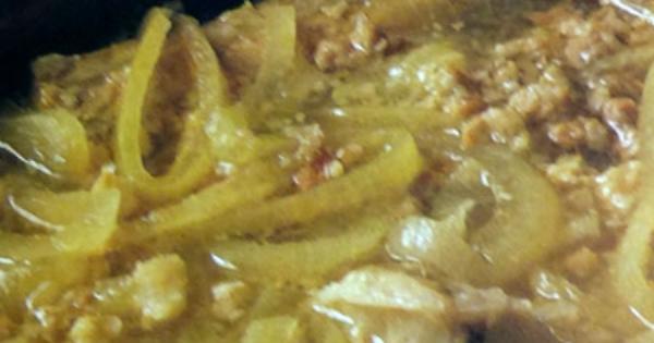 Ingredienti: 1 kg di cipolle bianche, 400 gr di costine di maiale, 200 gr di pane casereccio raffermo, 100 gr olio extravergine di oliva, 50 gr pancetta tesa, 50 gr di salsiccia, 1 costa di sedano, 1 spicchio di aglio, 1 carota, sale.