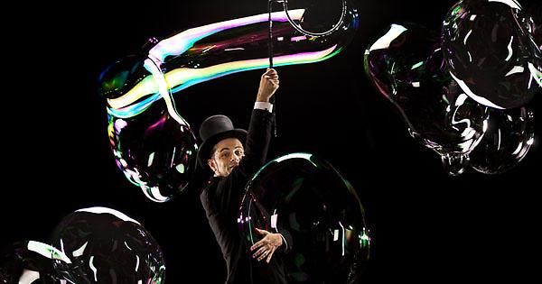 Mimo, clown, giocoliere e mago delle bolle: Michele Cafaggi è un eccentrico direttore d’orchestra che ci porterà nel mondo magico e rotondo delle bolle di sapone per un concerto dove l’imprevisto è sempre in agguato: da strani strumenti nascono bolle rimbalzine, bolle da passeggio, grappoli di bolle…