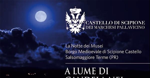 Sabato 16 Maggio 2015 in occasione dell’iniziativa Europea “La Notte dei Musei” il Castello di Scipione dei Marchesi Pallavicino, situato nel borgo medioevale sulle colline tra Parma e Piacenza, a 2 km da Salsomaggiore Terme, aprirà le sue porte per accogliere i visitatori nell’atmosfera magica di una notte incantata.