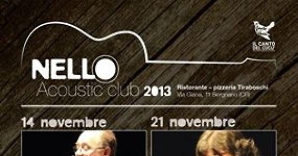NELLO ACOUSTIC CLUB è una mini rassegna dedicata alla musica d'autore ed acustica, che si articola in quattro incontri/concerto per quattro giovedì a partire dal 14 novembre 2013. Senza nessun obbligo di consumazione è possibile accedere liberamente alla sala principale del ristorante pizzeria di Nello Tiraboschi, un grande amico della musica e della buona cucina che con la collaborazione de IL CANTO DEL CUCÙ è promotore dell'iniziativa.