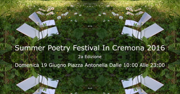 La 2a edizione del Summer Poetry Festival in Cremona, nella giornata di Domenica 19 Giugno in Piazza Antonella, dalle 10 alle 23, riunirà i linguaggi della poesia in numerosi eventi. Essi sono dedicati al movimento del Realismo terminale. Ai Reading di poesia dialettale. Giovane. Di testimonianza e performativa. Alla videoperformance. Alla performance ed allo Slam Rap. Ospiterà un Open Mic (Microfono Aperto) per la libera espressione dei partecipanti. Nella stessa intensa giornata del Festival sono previsti anche interventi musicali ed una esposizione pittorica. Il Summer Poetry Festival si rivolge alla partecipazione libera del pubblico ed a tutti coloro che condividono la comunicazione e la testimonianza del fare poesia offrendo con coerenza tematica per ogni espressione poetica un panorama di esperienze attraverso i singoli autori.