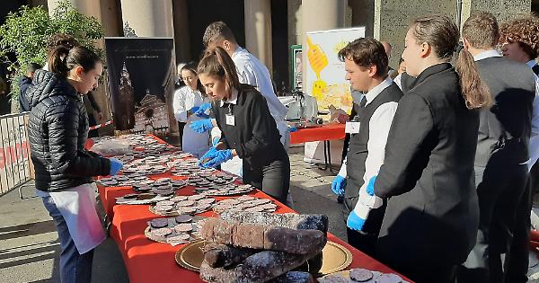 CREMONA - Per celebrare un’altra importante eccellenza alimentare cremonese, il salame, l’azienda Rivoltini Alimentare ha deciso di preparare un maxisalame di torrone che questa mattina in piazza Roma, lato Galleria XXV Aprile, è stato affettato davanti al pubblico per la gioia di tutti i golosi. Una maxi-installazione di torrone del peso di 300 chili che, per forma e apparenza, ricorda il famoso insaccato protagonista di un’altra celebre festa cittadina di successo. Sarà una piacevole sensazione per gli occhi e una decisa conferma per tutti i palati. Un dolce mandorlato Rivoltini ai frutti di bosco, copertura di cioccolato e migliaia di fette da distribuire alla marea di gente che sta riempiendo la citta: in modo migliore non poteva iniziare la seconda giornata della Festa del Torrone. Cristiano Rivoltini racconta come è nata l'idea del salame di torrone.