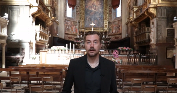 Non può che essere, infine, la Cattedrale di Cremona ad accogliere — dopo la presentazione di don Gianluca Gaiardi — la performance di Massimiliano Pegorini, attore professionista che dà fiato e corpo ai versi danteschi del Canto XXXIII del Paradiso, quello che conclude la Commedia. Mentre dà voce al fatidico «amor che move il sole e l'altre stelle», Pegorini percorre la navata centrale verso l’altare maggiore, con l’obiettivo delle telecamera che inquadra il catino absidale decorato da Boccaccio Boccaccino con il «Pantocrator» tra i Santi Marcellino, Imerio, Omobono e Pietro Esorcista.